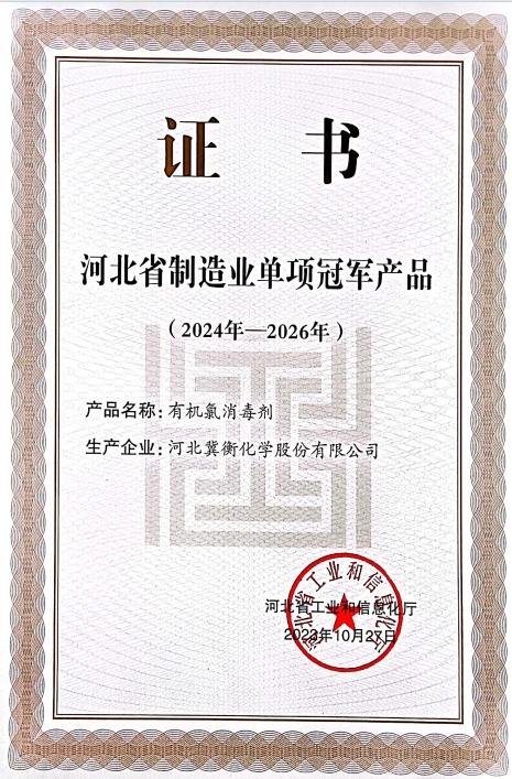 近日,河北省工業(yè)和信息化廳公布了《2024年河北省制造業(yè)單項(xiàng)冠軍企業(yè)名單》,河北冀衡化學(xué)股份有限公司憑借其在有機(jī)氯消毒劑行業(yè)領(lǐng)先的制造技術(shù)和全球領(lǐng)先的市場份額,榮獲“河北省制造業(yè)單項(xiàng)冠軍產(chǎn)品”稱號。